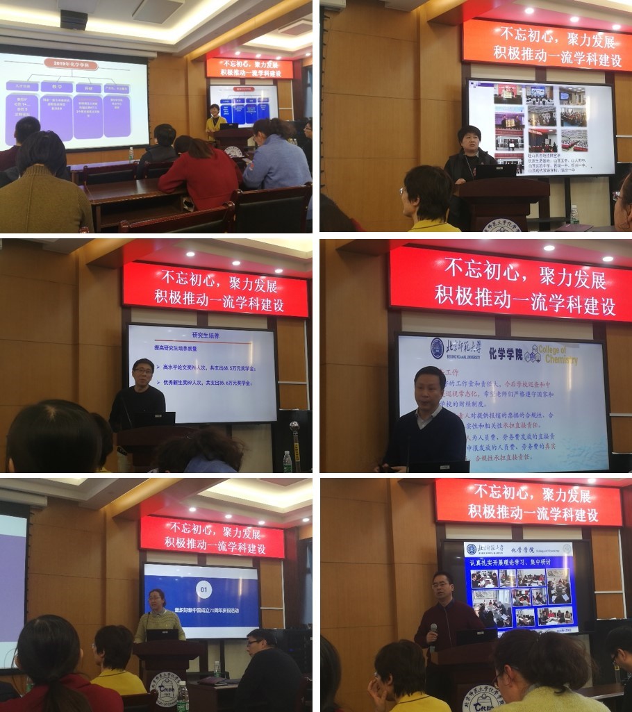 会议的第三阶段是bet365体育 党政领导班子述职。首先,范楼珍院长就bet365体育 整体工作做了报告,介绍了bet365体育 过去一年在人才引进、教学、科研、产业化等方面取得的成绩,鼓励全院教师新的一年继续努力工作、砥砺前行。魏朔副院长从教学日常工作、本科人才培养、教学条件建设、师范生认证、本科招生宣传等方面总结了bet365体育 本科教学工作。杨清正副院长介绍了bet365体育 研究生培养和科研相关工作,2019年,bet365体育 理论与计算光化学教育部重点实验室、放射性药物化学教育部重点实验室,两个教育部重点实验室均顺利通过评估。张俊波副院长代表bet365体育 对bet365体育 的财务工作、筹资工作和行政工作等进行了总结。bet365体育 党委副书记韩娟老师就学生管理和思政教育工作进行了总结。最后党委书记卢忠林老师从bet365体育 党委的总体情况、bet365体育 党委的主要工作、有关问题和工作思路三个方面介绍了bet365体育 的党建工作,过去一年bet365体育 党委深入落实“不忘初心,牢记使命”主题教育,积极配合学校巡察工作,积极促进学科建设等;卢老师还就bet365体育 的安全工作进行了汇报,并对全院老师提出要求,确保上级单位和bet365体育 的安全制度和规定落到实处。