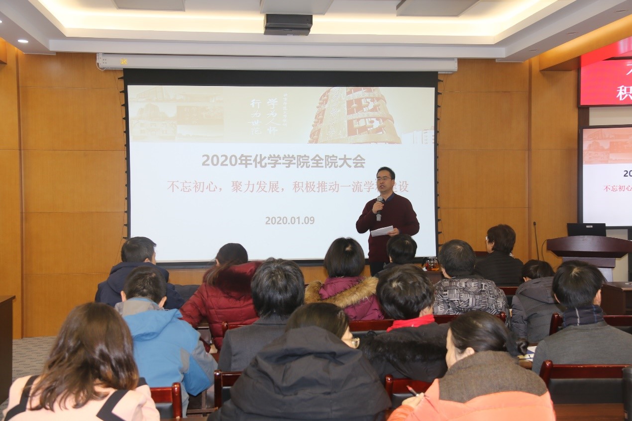 2020年1月9日,bet365体育 在化学楼二楼会议室召开了全院大会,会议主题是:不忘初心,聚力发展,积极推动一流学科建设。会议共分为4个阶段,由bet365体育 党委书记卢忠林老师和院长范楼珍老师主持,bet365体育 在校的教职工近百人参加了大会。