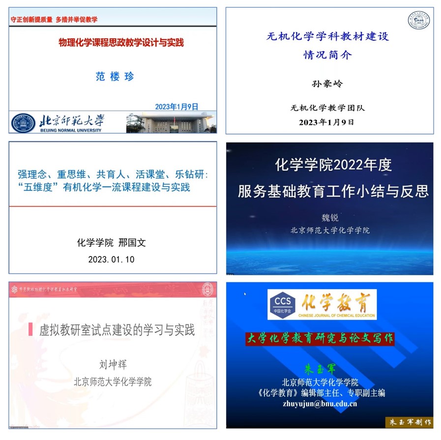 bet365体育 多位教师分享教育教学相关经验。范楼珍教授以“物理化学课程思政教学设计与实践”为题,深入探讨课程思政对人才培养的重要作用。作为教育部首批课程思政示范课程《物理化学》的主讲教师,范老师分享物理化学教学团队在课程思政方面的探索成果和实践经验,指出,理学专业课程要用“如春在花、如盐在水”“春风化雨、润物无声”的方式,培养学生的科学精神,激发学生科技报国的家国情怀和使命担当。孙豪岭教授以“无机化学专业教材建设情况简介”为题,介绍主编《无机化学》,并获批北京高校优质本科教材重点项目的建设过程;以及无机化学专业团队关于《无机化学学习指导》《无机化学电子教案》《中级无机化学》《无机化学实验》等多部高等教育出版社教材的规划、进展以及经验。邢国文教授以“五维度有机化学一流课程建设与实践”为题,围绕国家级一流本科课程“有机化学”近二十年的教学实践与思考,凝练“强理念、重思维、共育人、活课堂、乐钻研”的“五维度”教学新策略,并结合具体教学实例,阐释“五维度”课程建设的具体内涵和开展方式。魏锐教授以“bet365体育 2022年度服务基础教育工作小结与反思”为题,介绍bet365体育 以化学教育学科为特色,构建完善的化学基础教育多维支撑体系。通过在基础教材编写、科普与教师培训、基础学科共同体建设、化学期刊举办等多方面开展工作,充分体现bet365体育 重视高等教育与基础教育的高质量融合发展,将学科建设和教师教育的紧密结合,倾情服务教育强国战略和教育脱贫攻坚。刘坤辉副教授以“虚拟教研室试点建设的学习与实践”为题,介绍化学学院主持建设教育部首批“师范院校物理化学课程” 虚拟教研室的情况。围绕“为什么建”“建什么”“怎么建”的思路,说明虚拟教研室作为一种新的教育组织形态,是实施教育数字化战略行动的新探索和新模式,并针对内容、机制、团队、平台四个方面提出重点建设举措。朱玉军副编审以“大学化学教育研究与论文写作”为题作报告。作为《化学教育》期刊编辑部主任,朱玉军老师对化学教育论文写作提出建议和主张,就如何确定化学教育研究的目标选题、方案设计、数据分析等进行全面介绍,并强调化学教育未来需要在理论基础、研究方法、关注学生学习问题、融合基础课与化学前沿、融合理论课与实验课、论文写作质量等方面进一步发展。