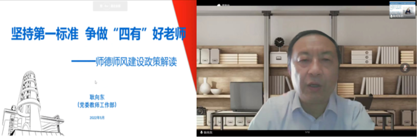 校党委教师工作部部长耿向东作了《坚持第一标准,争做四有好老师》主题报告。耿向东部长详细阐述了加强教师思政工作和师德师风建设的重要性,通报了全国高校发生的违反高校教师职业行为十项准则的典型案例进行警示教育,解读了教育部《新时代高校教师职业行为十项准则》《研究生导师指导行为准则》《关于高校教师师德失范行为处理的指导意见》等重要文件,重点介绍了我校师德师风制度建设和工作要求情况。报告最后,耿向东部长号召全院教师坚持教书和育人相统一,坚持言传和身教相统一,坚持潜心问道和关注社会相统一,坚持学术自由和学术规范相统一,做党和人民满意的“四有”好老师。
