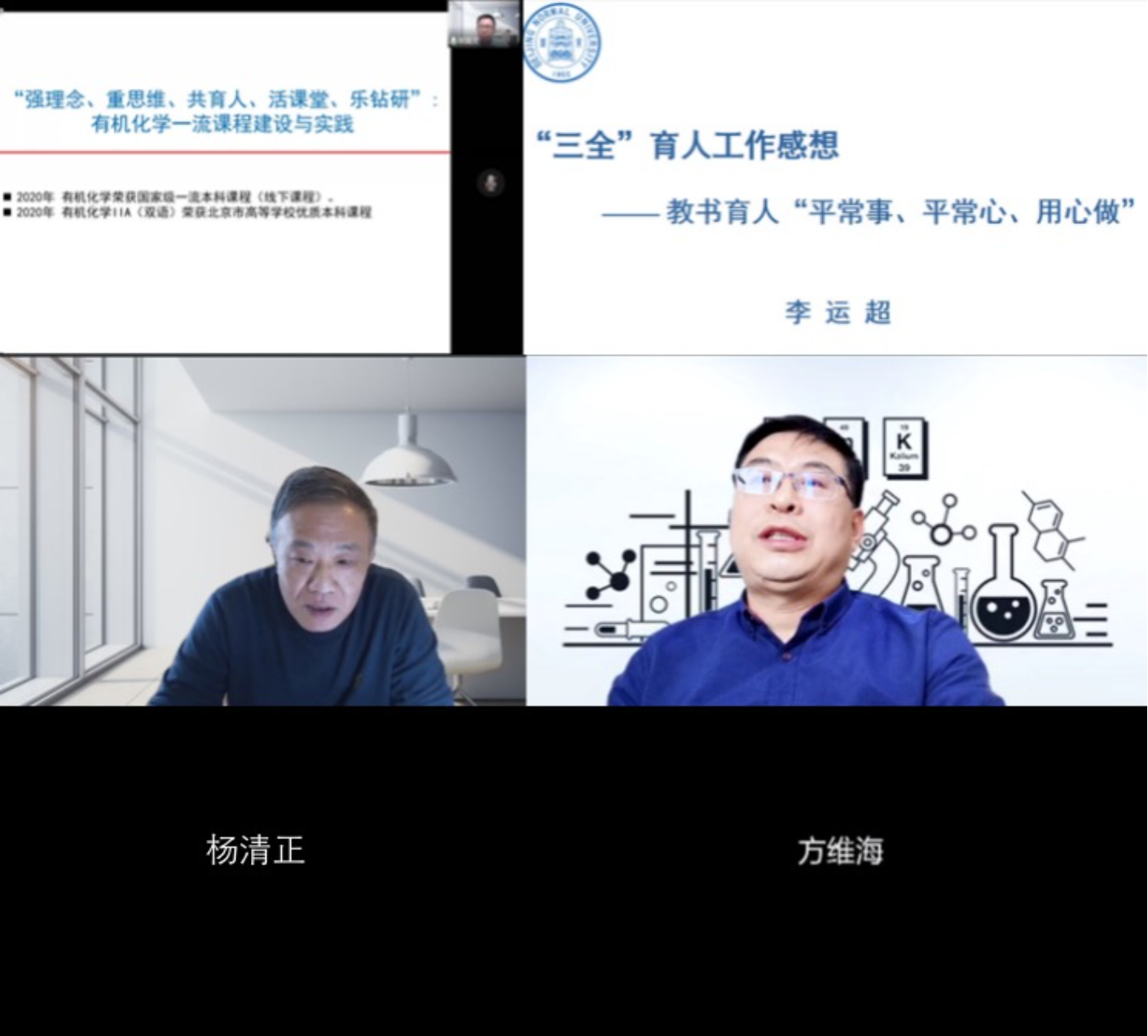邢国文、李运超老师分享了本科生教学经验。邢国文老师从课程思政育人的角度,用鲜活专业的教学案例,分享了培养本科生学习兴趣、化学思维逻辑和塑造科学家创新精神的方法。李运超老师分享了物理化学教学团队在三全育人方面的特色做法,引导学生以问题为导向进行自主学习,组织学生翻转课堂实现自我教育。