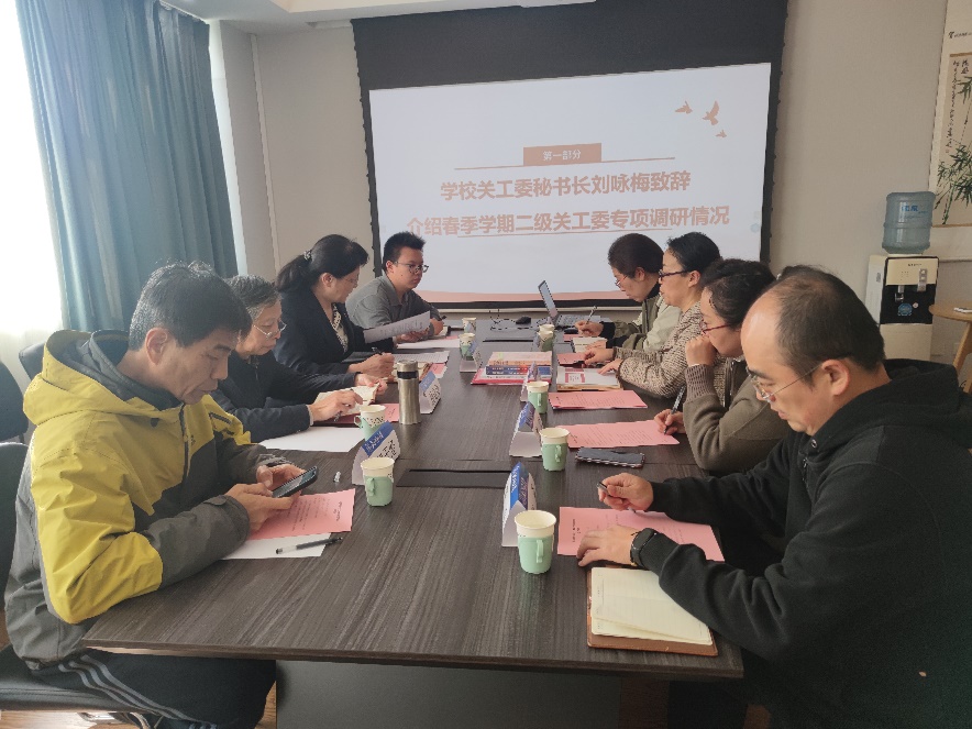 学校关工委秘书长刘咏梅传达了中共中央办公厅、国务院办公厅和教育部党组关于做好关心下一代工作的系列文件精神,介绍春季学期二级关工委专项调研情况。她强调,习近平总书记对关心下一代工作的重要指示和一系列文件体现了党中央对关工委工作的关怀和重视、对“五老”的期望,各二级关工委要抓好组织、队伍、体制机制建设,为老同志发挥作用创造条件。