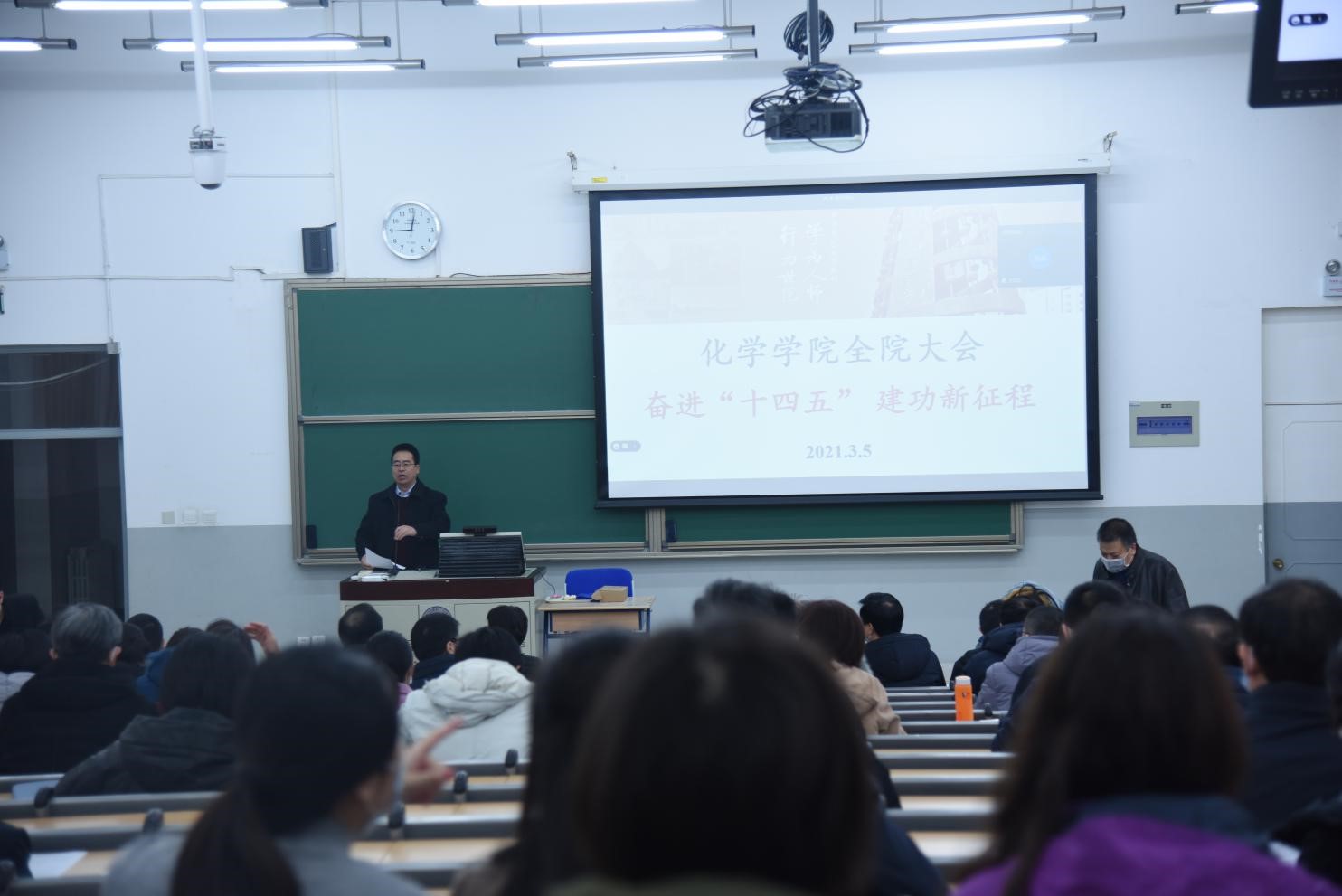2021年3月5日,bet365体育 在化学楼化二教室召开了全院大会,会议主题是:奋进“十四五”,建功新征程。bet365体育 在京教师在主会场参会,在珠海承担教学科研任务的bet365体育 教师通过视频形式参会。会议共分为4个阶段,第一和第二阶段由bet365体育 党委书记卢忠林老师主持,第三和第四阶段由bet365体育 院长范楼珍老师主持。