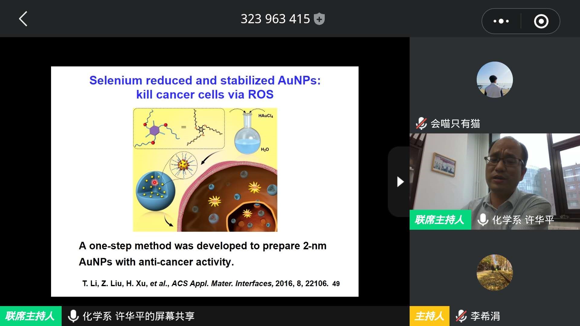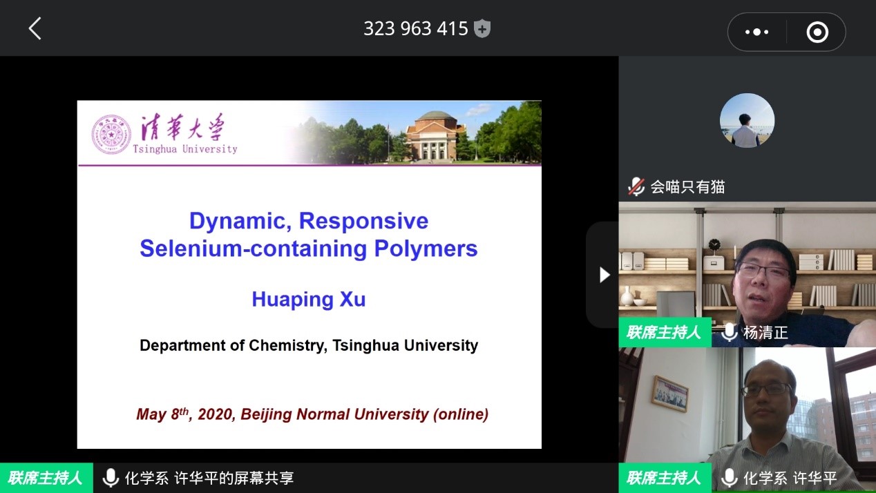 2020年5月8日15:00,由bet365体育-bet365亚洲官网 研究生会举办的BNU化学“云讲堂”系列讲座再次开讲,清华大学许华平教授应邀在腾讯会议平台上为bet365体育-bet365亚洲官网 师生作了题为《动态响应性含硒高分子》的精彩报告。本次讲座由bet365体育 副院长杨清正教授主持。