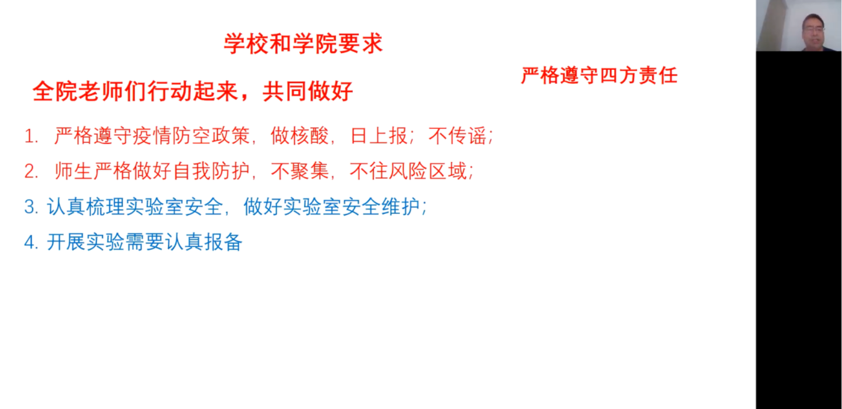 bet365体育 党委书记卢忠指出,北京市疫情形势严峻复杂,疫情风险离学校越来越近,已经传播至校园周边的多个点位,学校与疫情的较量正处于最关键的节点,全院教师务必提高政治站位,增强疫情防控工作的政治自觉、思想自觉和行动自觉,严格遵守四方责任,认真配合学校和bet365体育 的各项防疫工作安排,坚定信心、以身作则、积极行动,同时,将实验室安全工作落实落细,关注仪器设备的维护,杜绝安全事故,及时了解和回应学生需求和困难,加强对学生的思想引导、心理疏导、就业帮扶等工作,坚持“一边抗疫情,一边谋发展”提前做好相关工作预案,统筹规划教育教学和科学研究等工作。