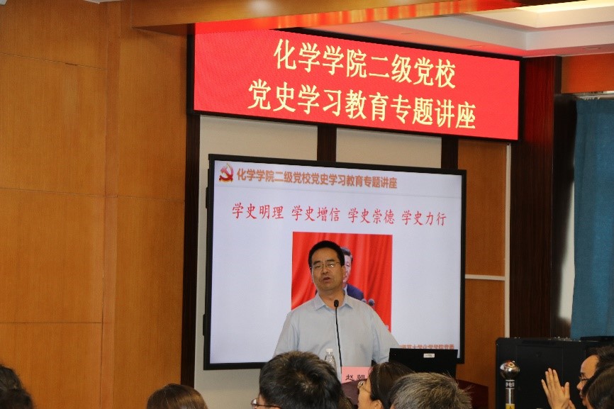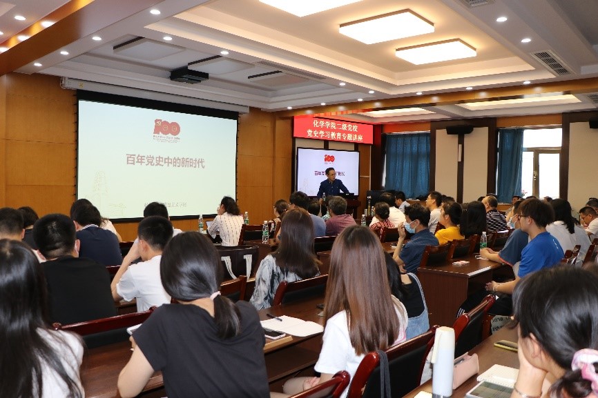 为庆祝中国共产党成立100周年,2021年6月23日,bet365体育 二级党校邀请北京师范大学马克思主义bet365体育 赵朝峰教授开展“百年党史中的新时代”党史学习专题讲座。bet365体育 教师党员代表和学生党员代表在化学楼二楼会议室参加了学习。