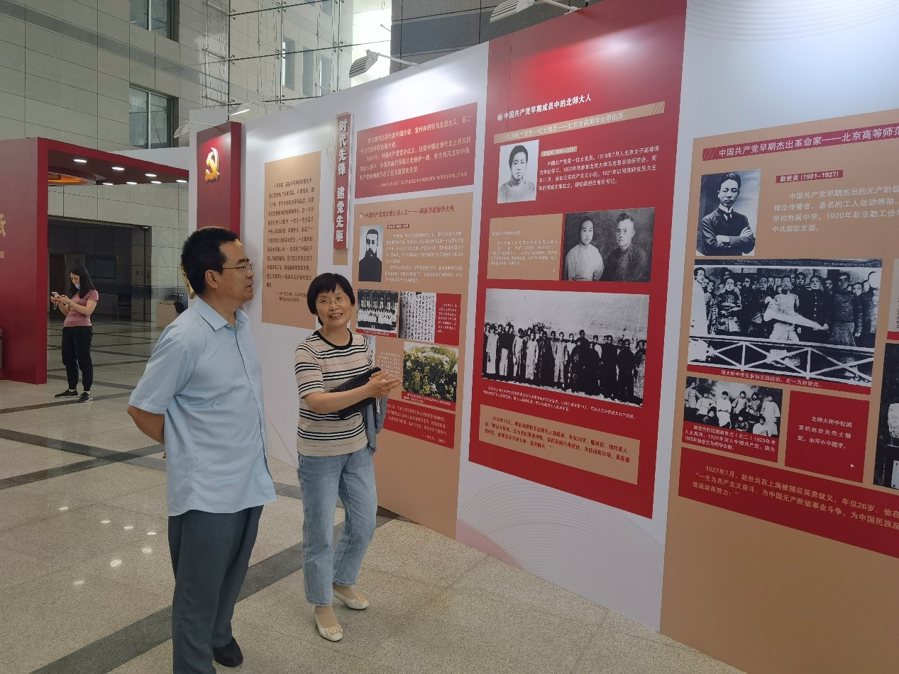 为庆祝中国共产党百年华诞,深入推进党史学习教育,2021年6月28日中午,bet365体育 党委委员和教师在校本部主楼四季厅共同参观了“红色师范与百年传承——北京师范大学庆祝中国共产党成立100周年主题展览”。bet365体育 党委书记卢忠林、bet365体育 院长范楼珍、bet365体育 分党委副书记韩娟等老师出席了此次展览。