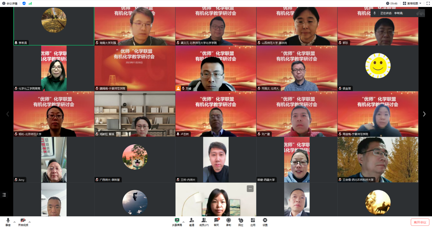 为深入探索“优师计划”化学人才培养规律,进一步提升有机化学教学质量,2023年11月30日,北京师范大学bet365体育 组织召开了第三期“优师”化学联盟有机化学教学线上研讨会,此次研讨会以数字化资源建设为主题。北京师范大学、青海师范大学、内蒙古师范大学、四川师范大学、宁夏师范bet365体育 、山西师范大学、西北师范大学、新疆师范大学等多所师范院校有机化学教师代表参加此次研讨活动。
