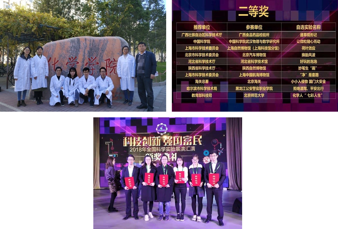 10月30日,由中国科bet365体育 科学传播局、科技部政策法规与监督司主办,以“科技创新,强国富民”为主题的2018年全国科学实验展演汇演在中科院物理所举行,来自全国35个参赛单位的96组科学实验展演团队齐聚北京,为公众呈现了一场生动有趣、精妙绝伦的科学表演盛宴,该展演汇演宗旨在于深入贯彻党的十九大精神,弘扬科学精神,普及科学知识,助力科技强国梦。北京师范大学参赛团队——孙根班课题组和卢忠林课题组联合组成科普团队,以“化学人——七彩人生”为参赛节目,将化学与材料学科交叉领域的学术成果与趣味化学实验相结合,既体现了当前化学领域和材料领域的研究前沿和热点,也表现出了极具观赏性的实验现象。该团队由北师大科技处推荐,教育部科技司进行初选,最终拿到进入决赛的资格。该团队经过一个多月的周密筹备与紧张排练,个人简介VCR制作,在10月30和10月31日两天的激烈角逐最终从专业科普表演队伍中脱颖而出,荣获2018年全国科学实验汇演展演大赛二等奖。据了解,本次比赛共设置10项一等奖,20项二等奖,30项三等奖,其余为优秀奖。