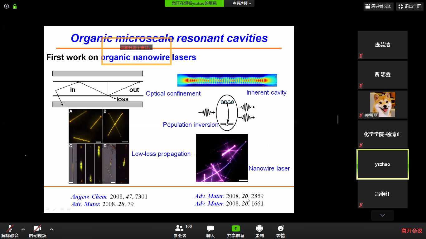 答疑环节中,有8位师生与赵教授进行了交流讨论,内容包括有机激光材料的选择标准、亲水亲油微球结构能否通过自组装得到、有机材料结构稳定性等。赵老师都一一耐心详细地做出了解答。