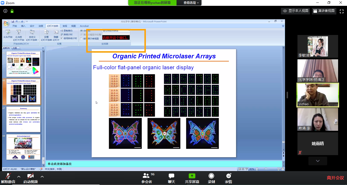 讲座开始之前,李希涓老师阐述了云讲堂系列活动的意义。接着,杨清正老师介绍了赵永生老师及其科研工作。赵永生老师从研究背景展开,讲解了有机微纳激光材料、有机激光产生中的激发态过程、有机激光在实际生活中的应用和应用面临的关键挑战等问题。