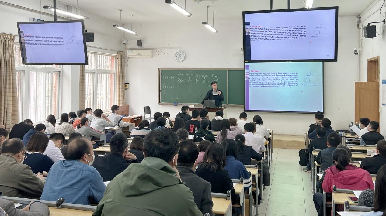 4月11日上午10:00-11:40,bet365体育 领导以及bet365体育 全体教师在生四教室观摩了邢国文教授主讲的《有机化学IIA(双语)》课程教学。该课程是本科学位基础课程,授课对象是化学专业大二本科生,教学内容是“芳香亲电取代与芳香亲核取代反应”。邢国文教授是北京市教学名师,为这次观摩课做了充分准备,课堂讲解条理清晰、重点突出、逻辑性强,带给大家诸多启发和思考。