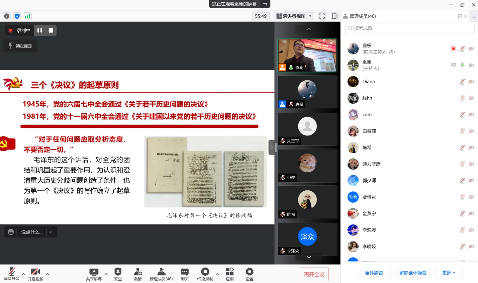 报告开始前,卢老师强调了学习十九届六中全会精神的重要性,并介绍了杨增岽教授的工作经历、研究领域以及所取得的重要成果。