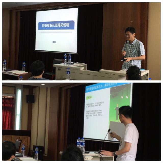 会议的第二阶段由范楼珍院长主持,进行了慕课课程建设和上线经验、师范类专业认证准备工作的交流。首先,邢国文教授以《普通化学》课程建设为例,从前期准备、课程拍摄、注意事项等方面向全院教师进行了慕课课程建设的经验分享;魏锐副教授则结合《普通高等学校师范类专业认证工作指南》,对师范类专业认证的意义、内容、前期筹备情况进行了简要说明,并对师范类专业认证工作进行了详细安排。