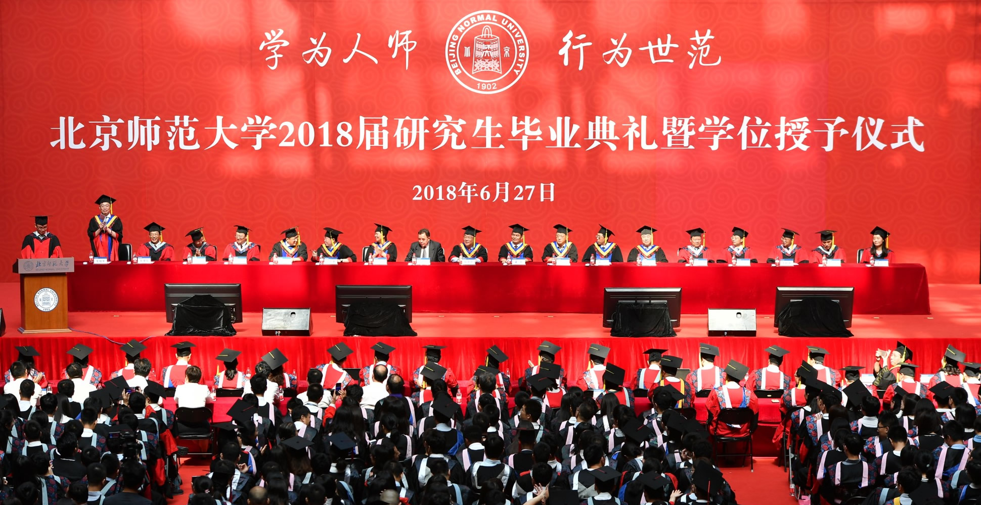 6月27日上午,我校2018届研究生毕业典礼暨学位授予仪式在邱季端体育馆举行。党委书记程建平,党委副书记、校长董奇,常务副校长史培军,党委副书记孙红培,副校长郝芳华、张凯、周作宇,党委副书记李晓兵,副校长王守军,学校学位评定委员会委员以及校友代表、中国出版协会理事长、原国家新闻出版总署署长柳斌杰学长出席典礼,各学部、院系和相关职能部处负责人,毕业班班主任和辅导员,教师代表以及34个学部、院系的600余名博士毕业生和近3000名硕士毕业生共同参加了典礼,800余名学生家长在分会场观看了典礼实况转播。典礼由常务副校长史培军主持。