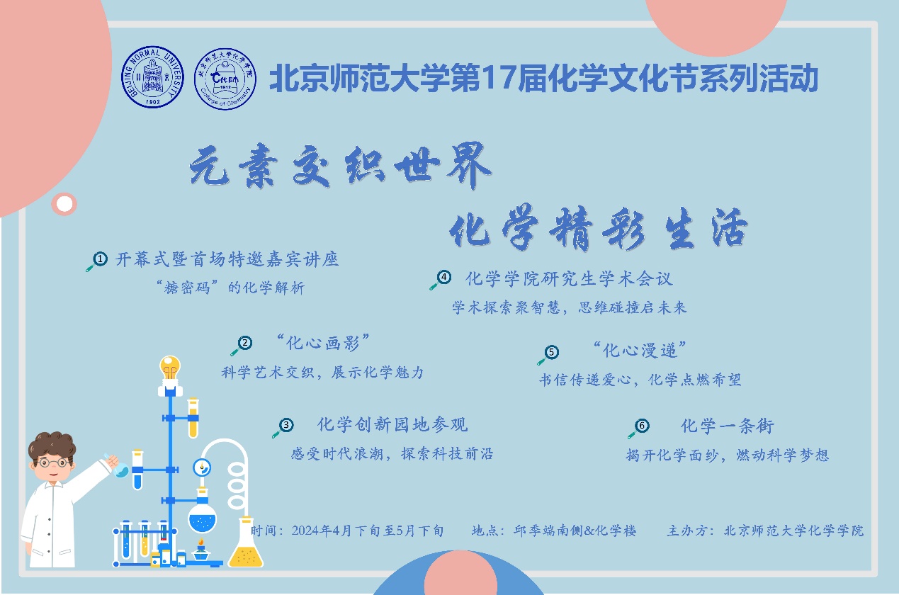 北京师范大学化学文化节面向全校师生,至今已举办十六届,旨在吸引、鼓励更多的青年学子走近化学学科、发现化学之美,自觉做科学家精神和教育家精神的传承者和弘扬者。第十七届化学文化节以“元素交织世界,化学精彩生活”为主题,包括六大板块和十四项活动,将在4-5月陆续开展。