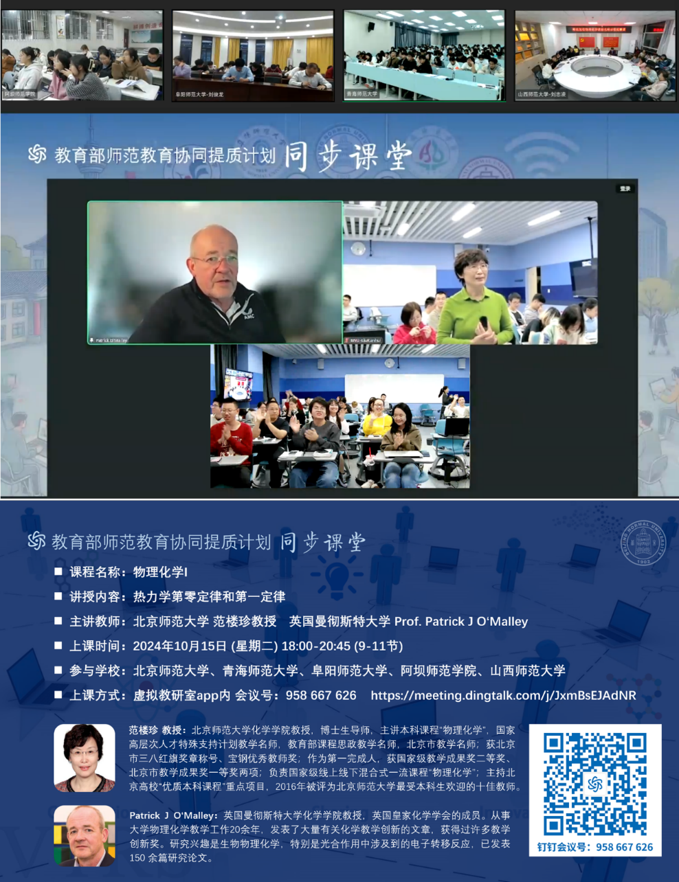 为深化高等教育数字化转型,推进教育部师范教育协同提质计划的有效实施,2024年10月15日,bet365体育-bet365亚洲官网 在教9楼501智慧教室成功进行了“物理化学”课程师范教育协同提质计划同步课堂。此次教学活动由北京师范大学范楼珍教授与英国曼彻斯特大学Patrick O'Malley教授协同授课,来自北京师范大学、青海师范大学、阜阳师范大学、阿坝师范bet365体育 和山西师范大学等五所师范院校化学专业的师生,借助现代信息技术相聚于云端,共同体验了中外合作混合教学等先进的教学模式,来自教育部“师范院校物理化学课程虚拟教研室”及教育部“101计划”的部分教师也观摩了同步课堂教学活动。
