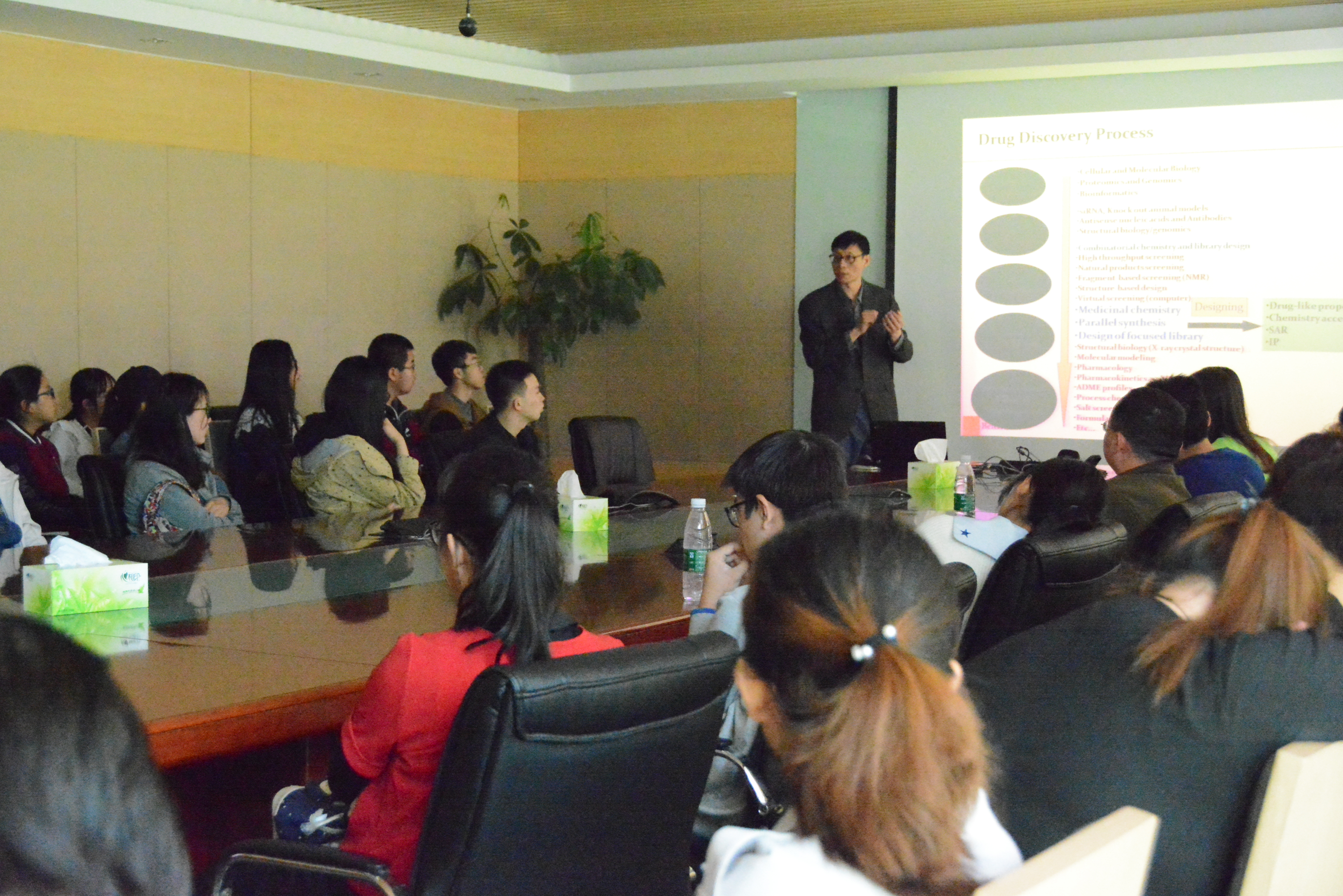 百济神州生物科技有限公司的化学首席研发总监王志伟博士热情地接待了我们。王总监首先向我们介绍了公司的核心团队成员、“要么不做,要做就做到最好”的发展理念、“立足中国,面向世界”发展战略和公司的发展概况。接下来,王总监跟我们介绍了公司主要从事癌症药物研发的全球性的生物制药公司。现有的癌症治疗方法中,主要有传统的化疗,还有近几年正在快速发展的靶向药物和免疫抗肿瘤药物。与传统的放化疗相比,后两类药物就像‘精巧炸弹’,疗效明显、可持续,而且副作用很小,给癌症患者带来了新的希望。目前,百济神州生物科技有限公司正在致力于新型分子靶向药、肿瘤免疫药与联合用药的研发。